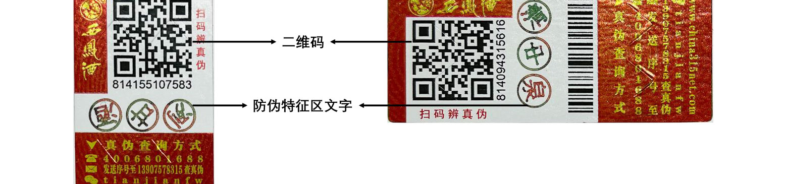 3、用手機微信“掃一掃”功能,掃描防偽標(biāo)簽上二維碼,進(jìn)入到西鳳酒產(chǎn)品真?zhèn)尾樵冺撁妫陧撁嫔蠈@示防偽特征區(qū)上的文字特征圖像,將實物標(biāo)簽和手機顯示的防偽特征圖像進(jìn)行比對,二者的防偽特征文字組合內(nèi)容、顏色、單個文字旋轉(zhuǎn)角度都相符則為正牌產(chǎn)品標(biāo)識;